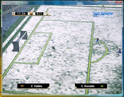 C:\Archivos de programa\KONAMI\Pro Evolution Soccer 2010. - Inicia el juego y disfruta de tus partidos en un campo nevado con líneas amarillas.